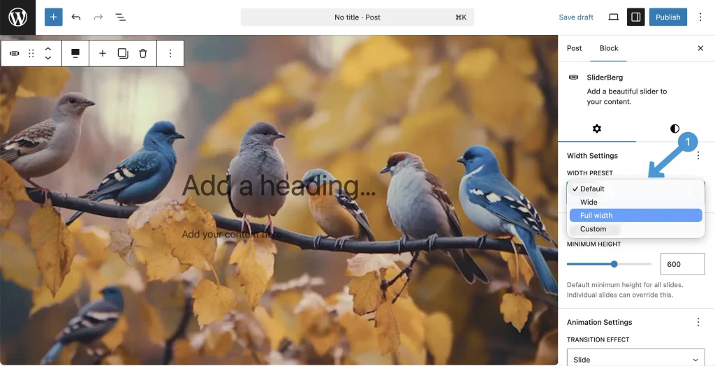 Sliderberg lets you control the overall size of your slider with width and minimum height settings. You can adjust the slider width to fit your layout and set a minimum height to keep it consistent.